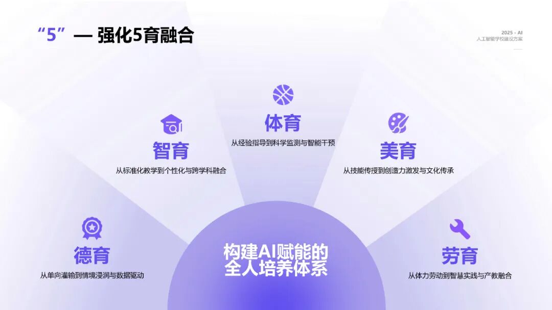 首先,AI 水手以“人工智能学校建设方案”奠定五育融合的整体框架,在这一方案中,五育是以系统结构的方式被统筹推进: